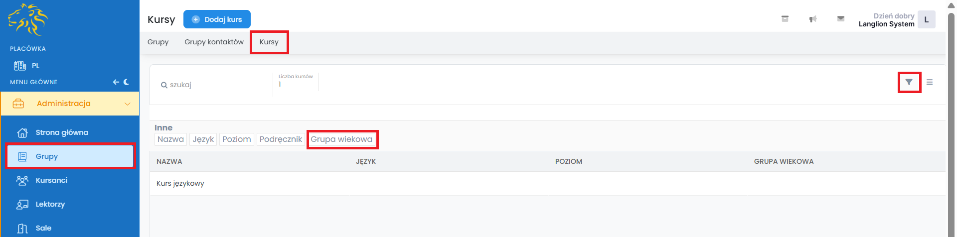Grupa wiekowa została dodana do kursu, teraz możesz filtrować listę kursów według kryterium grupy wiekowej. W tym celu, wybierz opcję „Filtruj”.