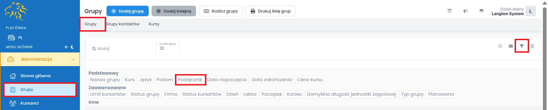Możesz teraz także filtrować grupy po wybranym podręczniku. W tym celu: