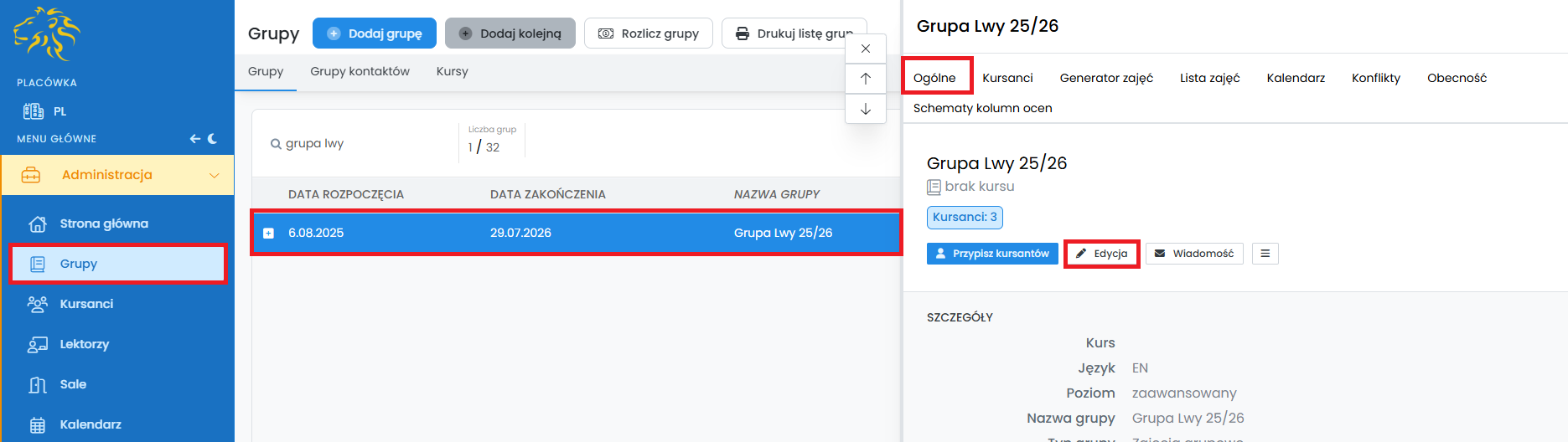 2. Wybierz grupę i kliknij w ikonę „Edytuj”.