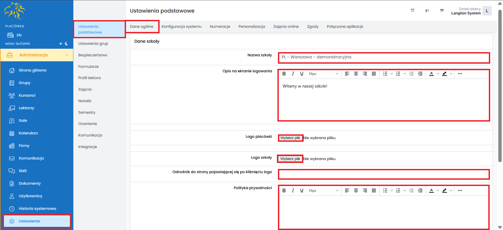 - Jeżeli prowadzisz politykę bezpieczeństwa, zamieść jej treść w danych ogólnych. Będzie ona widoczna dla kursantów i lektorów.