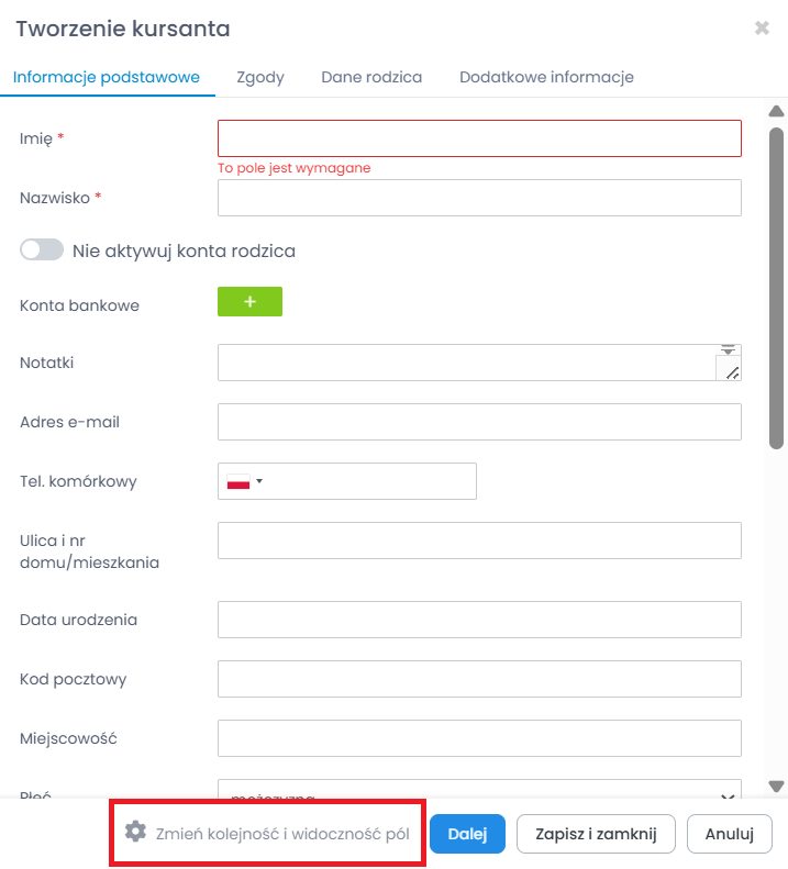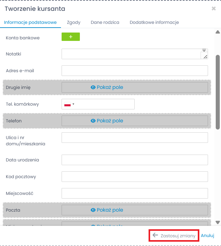 Zwróć uwagę, że raz naniesione zmiany będą uwzględnione u każdego kursanta czy grupy. Oznacza to, że jeśli będziesz chciał dodać kolejną osobę, formularz wyświetli tylko te pola i w takiej kolejności jak zostały wcześniej ustawione.