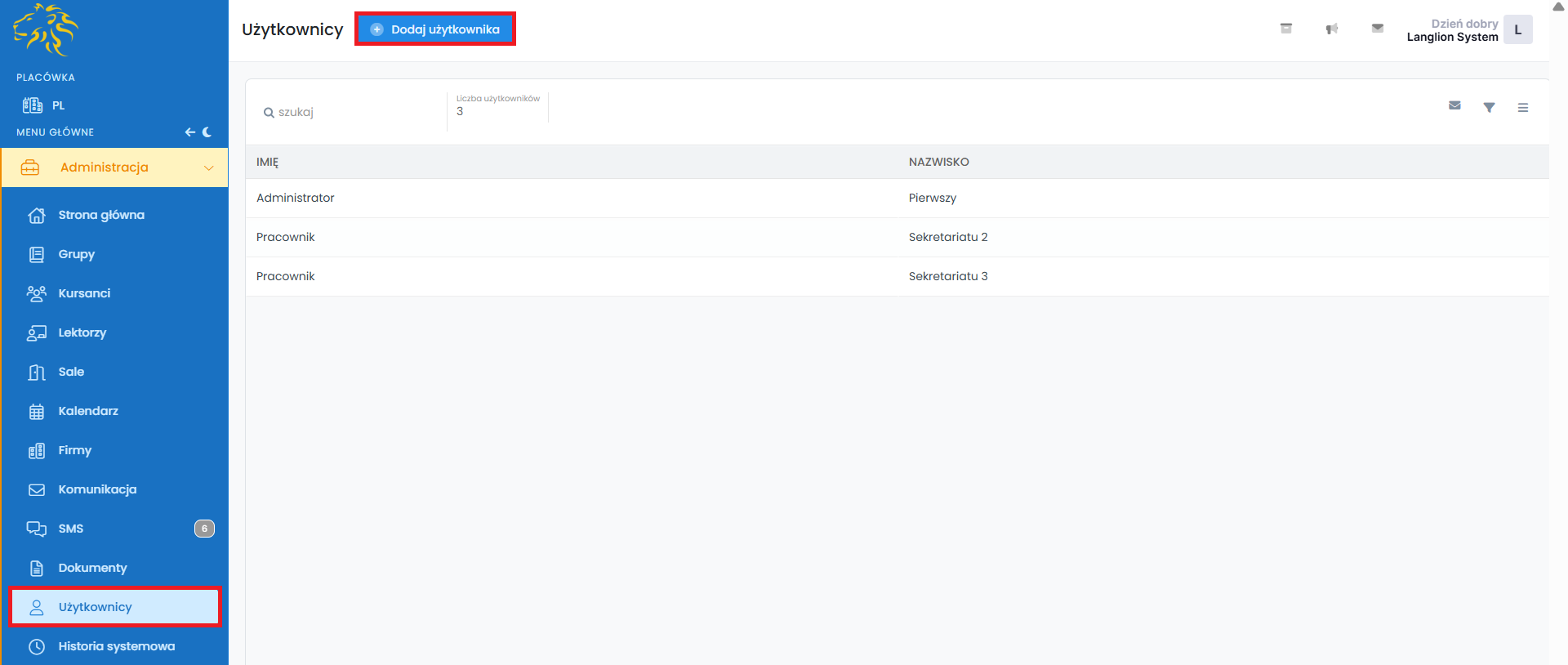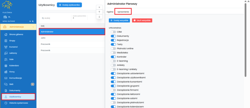Platformą Langlion może zarządzać kilku administratorów. Po dodaniu administratora nadaj mu uprawnienia, w obrębie których będzie wykonywał swoje obowiązki.