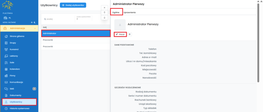 to proste, wystarczy, że wejdziesz w zakładkę „Administracja” i „Użytkownicy”. Następnie, wybierz użytkownika z listy i w zakładce „Ogólne”, kliknij w opcję edycji.