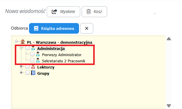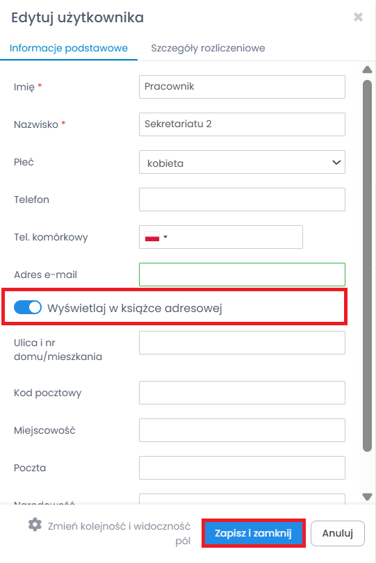Posiadając odpowiednie uprawnienia do zarządzania użytkownikami możesz zdecydować, który z nich będzie się wyświetlał w książce adresowej, aby pozostali pracownicy, lektorzy oraz kursanci mogli się z daną osobą kontaktować.